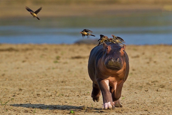 Фотограф Марк Мол сделал в Замбии удивительные снимки малыша-бегемота, напуганного стаей птицДля бегемотов птицы обычно являются хорошими друзьями (например, уничтожают на них паразитов), но этот смешныш еще слишком мал и не знает, что птицы не причинят ему вреда*бежит орёт*